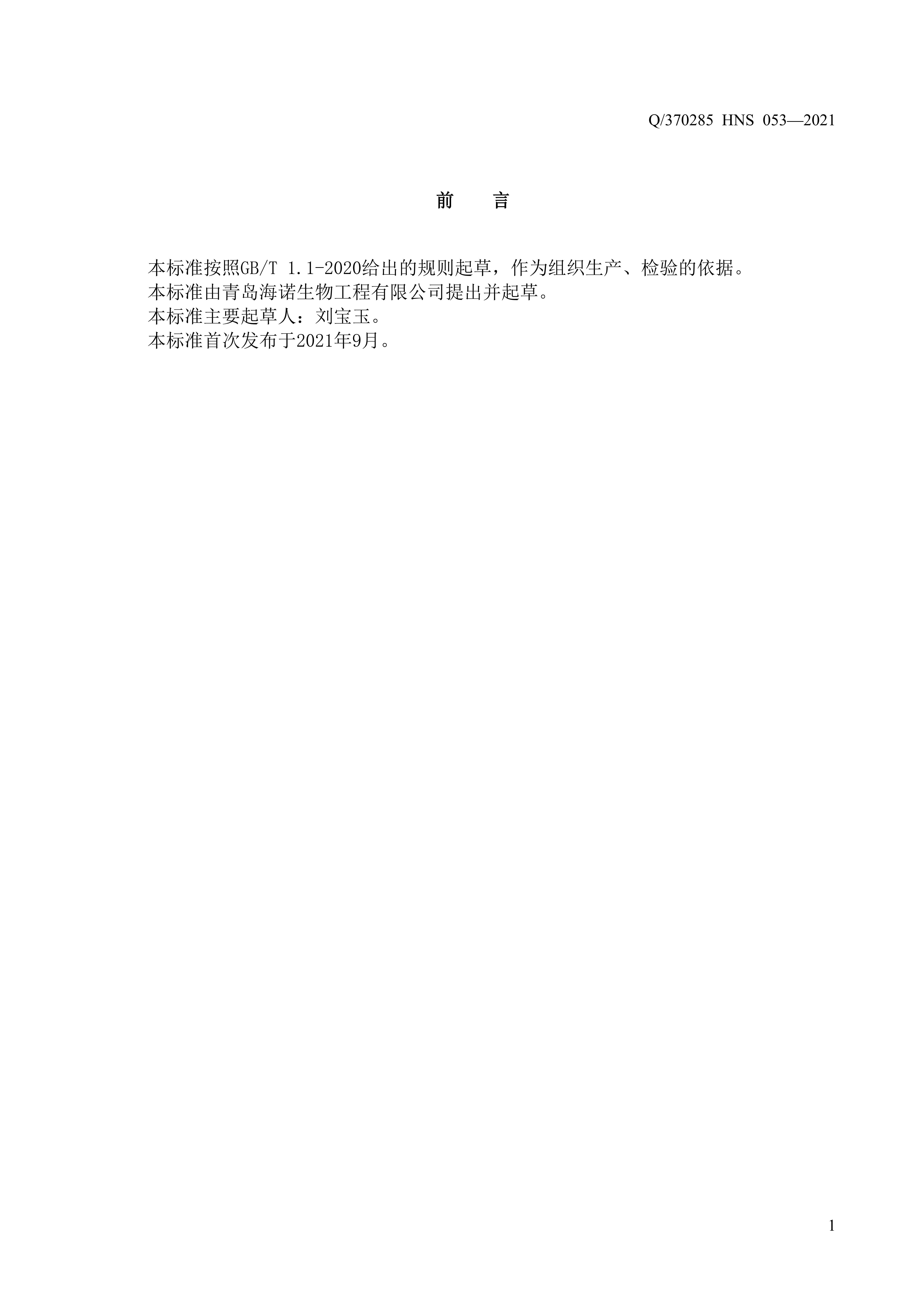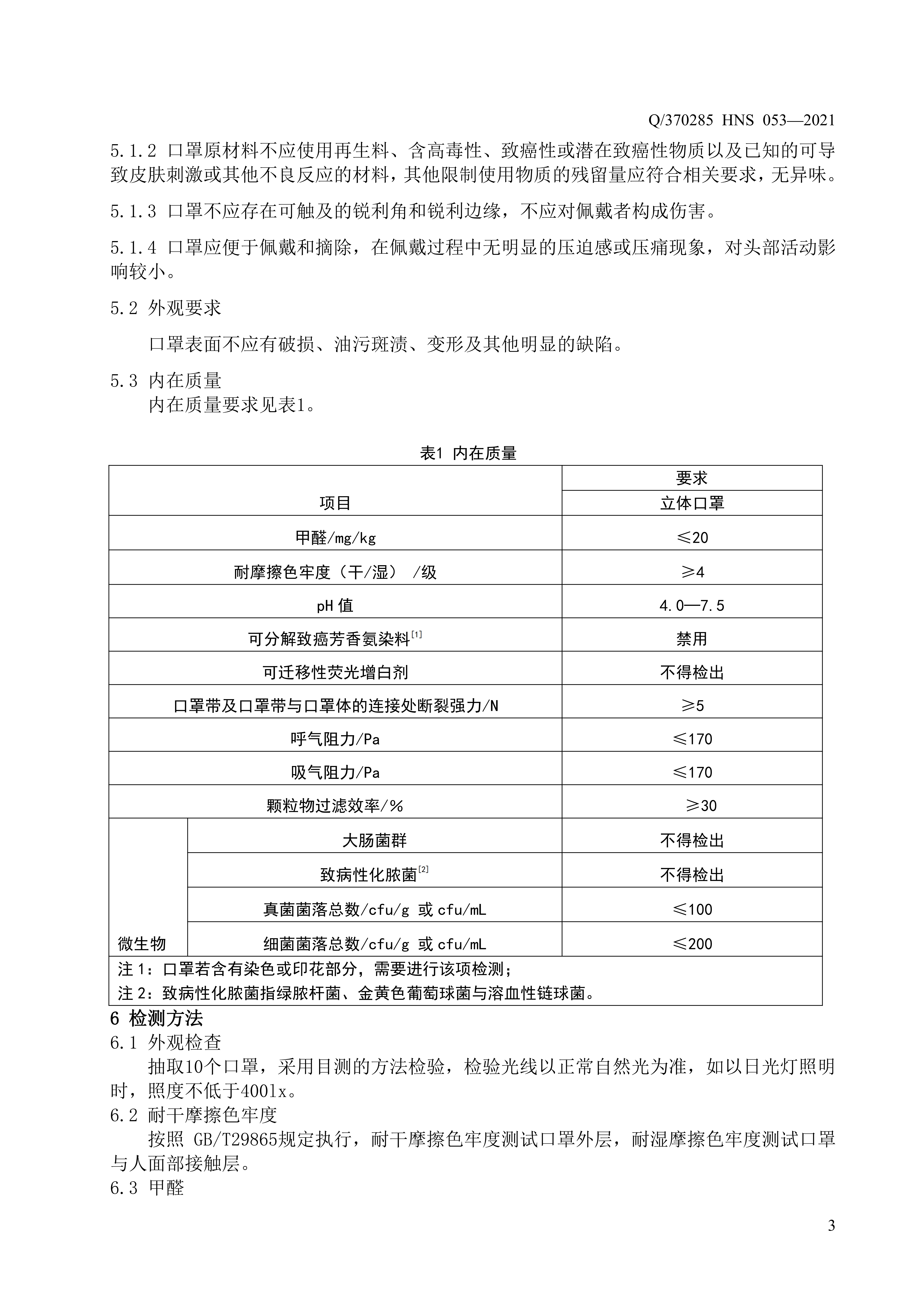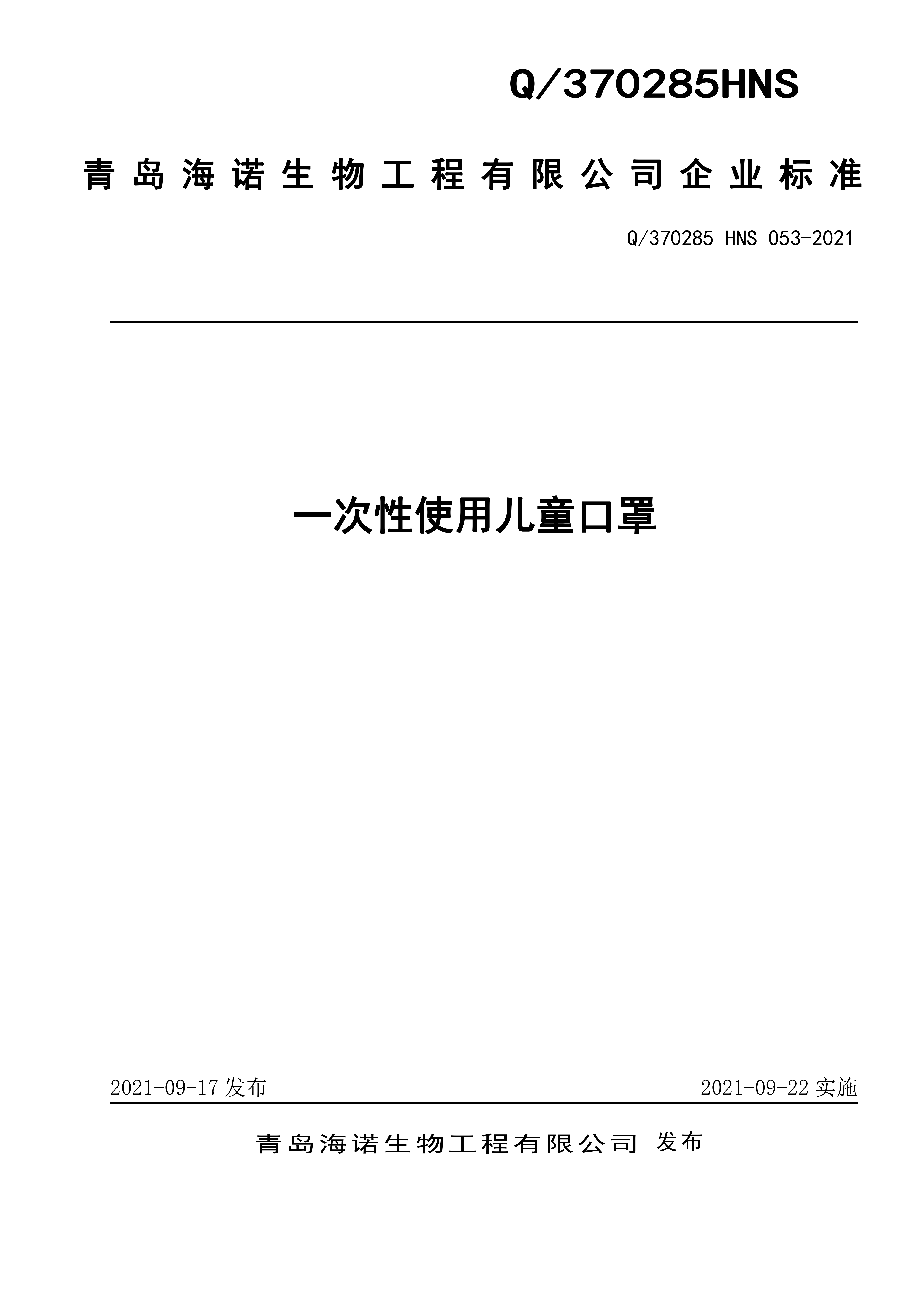 青岛海诺生物工程有限公司企业标准 — 一次性使用儿童口罩
